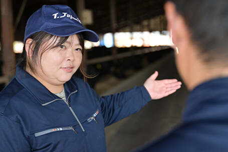 会社全体として落ち着いた雰囲気があり、肥育現場でも声掛けなどコミュニケーションを大切にしていると感じます。分からないことがあれば、先輩方が丁寧に教えてくれますし、安全面や牛の管理に対する意識の高い職場で、人間関係も良く、安心して仕事に取り組めると思います。